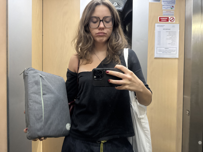 A young female individual is depicted in an elevator, taking a selfie reflecting off a polished surface, likely a mirror or stainless steel door. The individual has shoulder-length brown hair, wears large black-framed glasses, and a dark, off-the-shoulder long-sleeved top over dark trousers. Her fingernails are painted red. In her right hand, she holds a black smartphone with a visible triple-lens camera array, positioned to capture the image. In her left hand, she holds a rectangular grey fabric bag or laptop sleeve featuring a light green vertical zipper and a circular logo on the lower right. A white tote bag is visible on her right shoulder. The elevator interior features light wooden paneling on the side walls and a reflective surface directly in front of the individual. On the right-hand wall, above a stainless steel panel, two white rectangular signs with Portuguese text are affixed. The upper sign displays a red circle with a diagonal line over a cigarette, indicating "PROIBIDO FUMAR" (No Smoking), inverted due to reflection. Below it, a sheet of paper with the heading "AVISO" (Notice) and additional text is visible, also reflected. Based on the visible Portuguese signage, the scene is located in Portugal. As requested, this specific location is within the city of Oeiras.