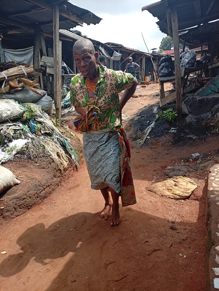 The image depicts an outdoor scene in Obosi, Nigeria, centered on an adult individual standing barefoot on a reddish-brown dirt path