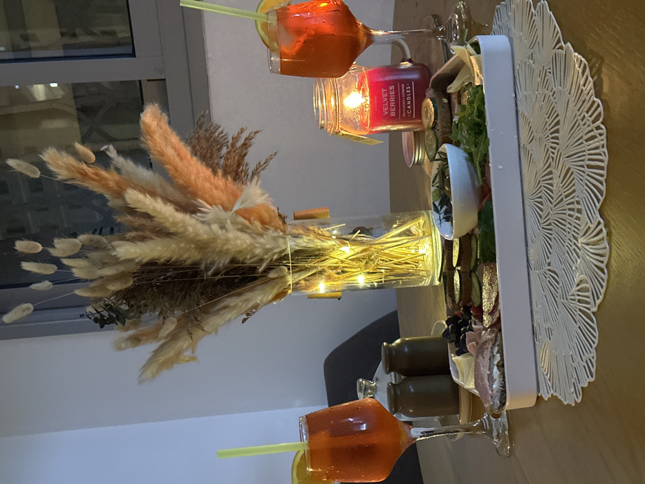 A table arrangement includes two orange beverages with straws, a lit "Velvet Berries" candle, and a glass vase filled with dried wheat stalks illuminated by fairy lights, topped with various dried grasses