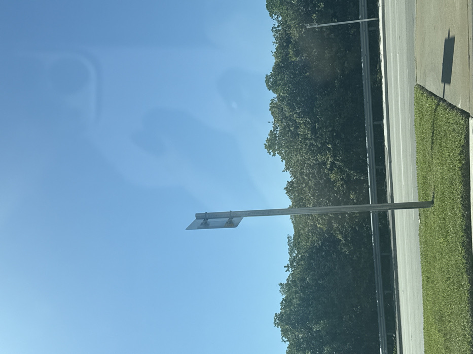 The image depicts an outdoor daytime scene under a clear, cloudless blue sky, situated along a roadway in North Miami, United States. In the foreground, a strip of manicured green grass occupies the lower left, transitioning to a light-colored concrete sidewalk or shoulder on the lower right, where a distinct, elongated rectangular shadow is cast. Centrally located on the grass, a vertical, reflective metal pole stands, supporting the rear of a rectangular road sign, which is angled slightly away from the camera. Immediately beyond the pole and sidewalk is a paved, multi-lane asphalt roadway, marked with white solid lines. A horizontal, silver-colored metal guardrail runs across the mid-ground, serving as a barrier between the roadway and a dense, uniform treeline composed of dark green, leafy foliage that extends across the entire background. The sky in the upper portion of the frame exhibits several faint, diffuse, and translucent patterns, consistent with reflections or smudges on a viewing surface, one notably resembling a large, stylized numeral "2". No human subjects, animals, or active vehicles are visible within the frame.