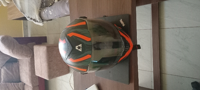 The scene is set indoors, in Kisumu, Kenya. A black motorcycle helmet with a clear visor, featuring orange and dark grey accents, and a white triangular logo containing a star, is resting on an open black Lenovo ThinkPad laptop. These items are placed on a brown wooden table. In the background, to the left, a light brown upholstered sofa with a darker purple frame is visible, accompanied by a matching square upholstered ottoman. To the right, a textured, light-colored fabric or blanket is draped over an adjacent wooden surface. The floor is covered with light-toned tiles, and a light-colored wall forms the background. No people are present, and no overt actions or interactions are depicted.