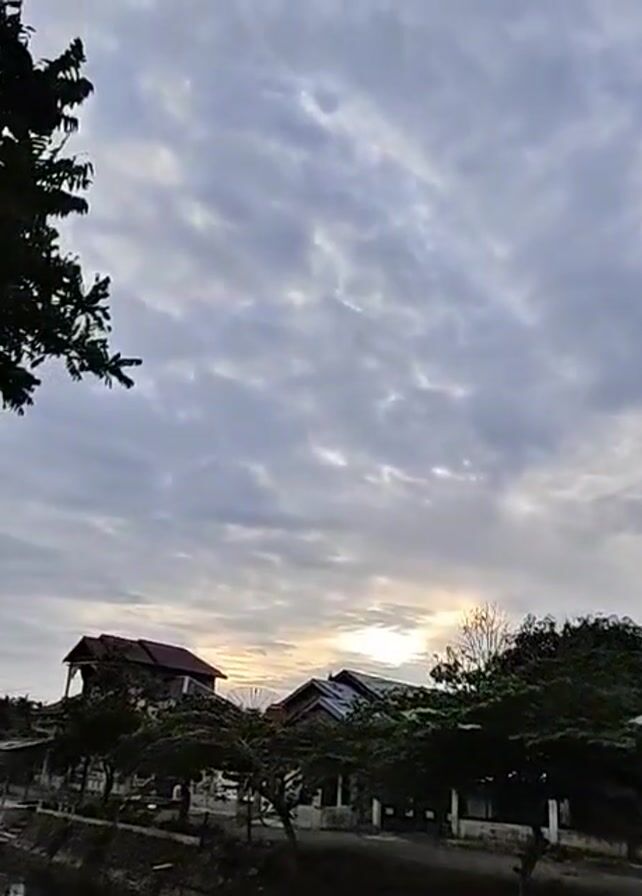 The camera pans up from a row of houses with dark roofs and trees, towards a communication tower that reaches high into a cloudy, overcast sky. The tower is silver-colored and sits behind a palm tree and other greenery. A wire stretches from the tower towards an unseen destination. The sky is predominantly gray with patches of lighter areas.