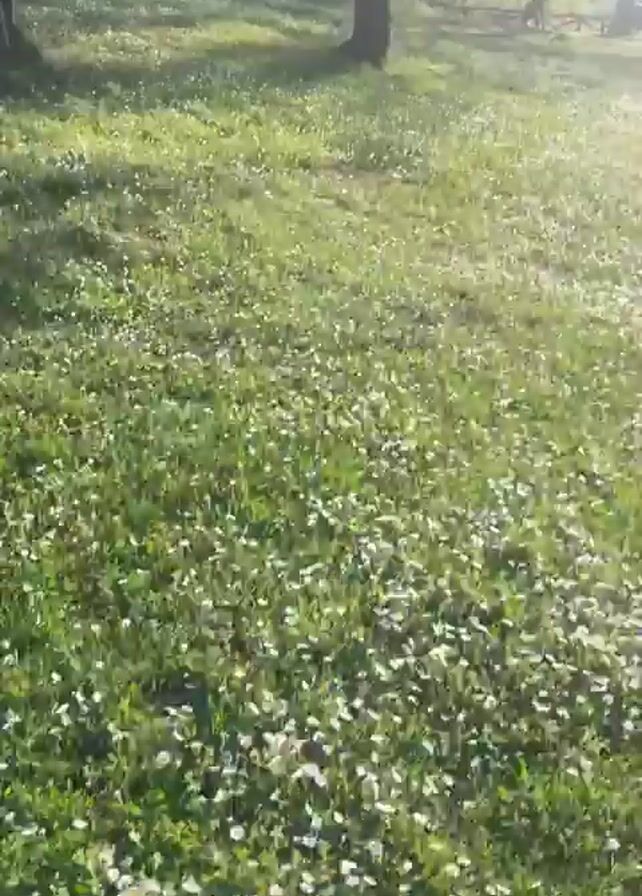 The video starts with a close-up view of a field of green grass dotted with small white flowers