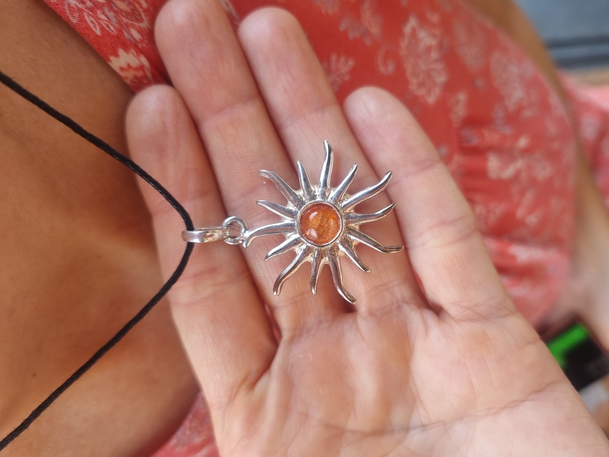 The image, reportedly from Bengaluru, India, shows a close-up view of a light-skinned hand presenting a silver-colored sun-shaped pendant. The pendant features a central amber-orange cabochon stone surrounded by approximately eleven radiating, pointed rays. It is suspended from a thin black cord, part of a necklace worn around the unseen neck of the individual holding it. A portion of the individual's upper chest and a red garment with a repeating light-colored floral or abstract pattern are visible in the blurred background. A faint, unidentifiable green and black blurred object is partially visible at the bottom left. The scene is illuminated by natural light.