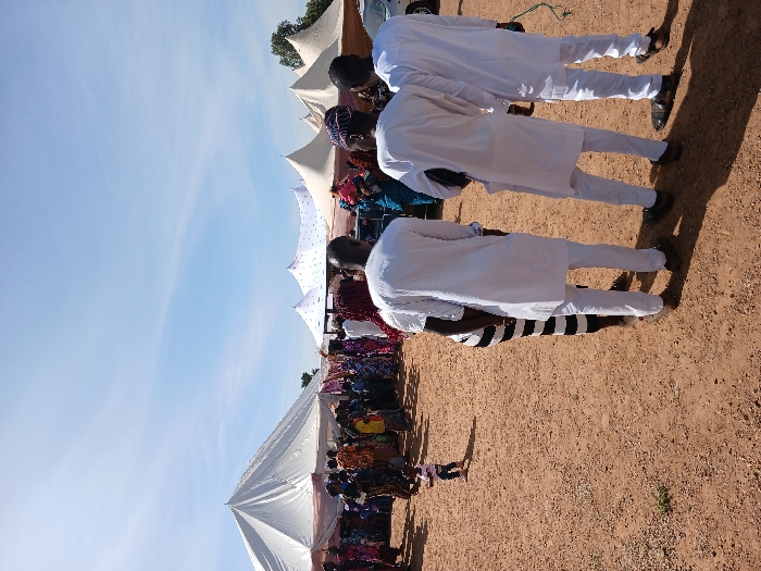 An outdoor scene in Gwolong, Nigeria, captures a daytime social gathering