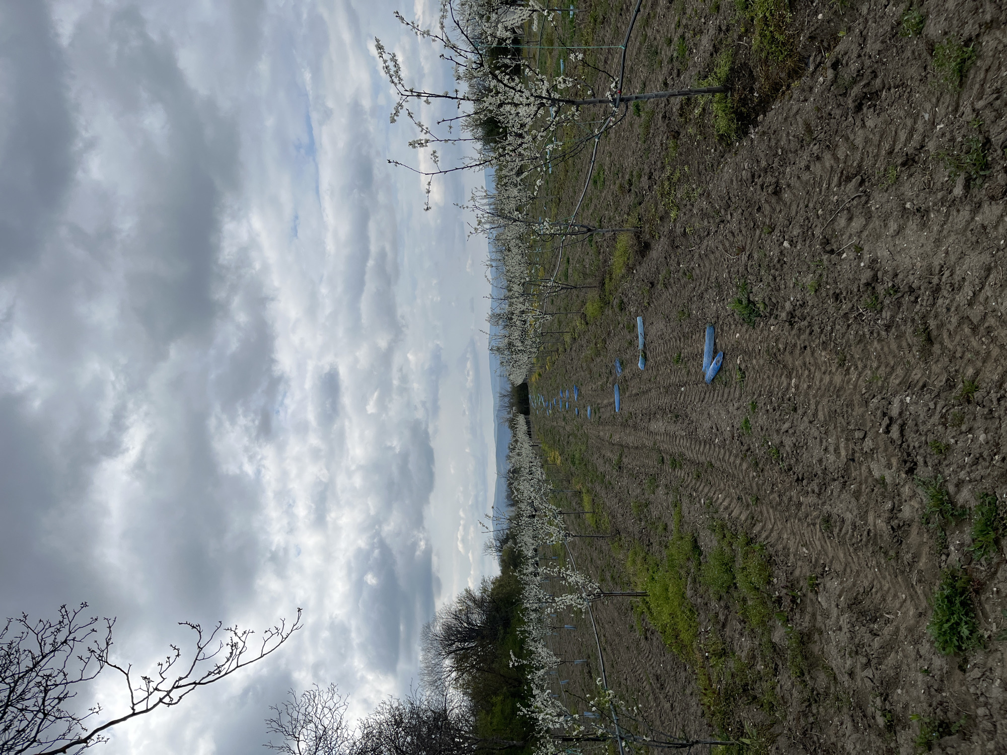 n orchard near Kran, Bulgaria. Rows of young trees, in full bloom with white flowers, stretch into the distance under a cloudy sky. The ground between the rows is tilled and shows tire tracks, with some vegetation emerging. Blue plastic tubes are visible near the base of several trees, likely for protection or irrigation. In the foreground, bare branches of trees are visible, while a distant mountain range appears faintly on the horizon.