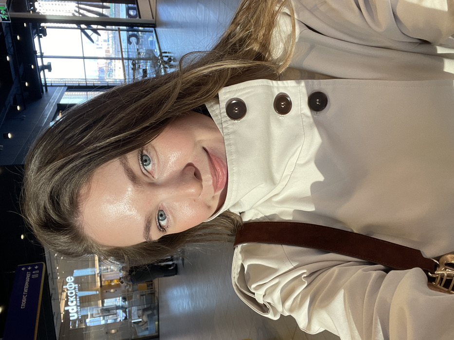 The image depicts a close-up selfie of a young adult female taken indoors at a commercial establishment. The location is identified as a shopping center in Kommunarka, Russia, specifically indicated by a sign pointing to "ГЛОБУС ГИПЕРМАРКЕТ" (Globus Hypermarket) and the adjacent "udscafe" (Upside Down Cake) coffee shop. The female subject has light blue eyes and light brown hair. Her skin appears moisturized with a slight sheen. She is smiling subtly, looking directly at the camera. She wears a light-colored (beige or cream) high-collared jacket or trench coat with three prominent dark brown buttons visible on the right side of the collar flap. A dark brown strap, likely from a bag, is visible over her right shoulder. The background shows a brightly lit interior space with light-colored flooring. To the left, the glass-fronted udscafe is visible with a few indistinct figures inside. Above it, a directional sign for Globus Hypermarket is mounted. To the right, large windows reveal an outdoor urban environment with distant buildings and what appears to be a body of water under a clear sky. Several shopping carts are present near the windows. The ceiling is dark with visible structural elements and recessed lighting fixtures. The overall environment suggests a modern, spacious retail complex. No explicit interactions with other individuals are observable beyond the general presence of people in the background.