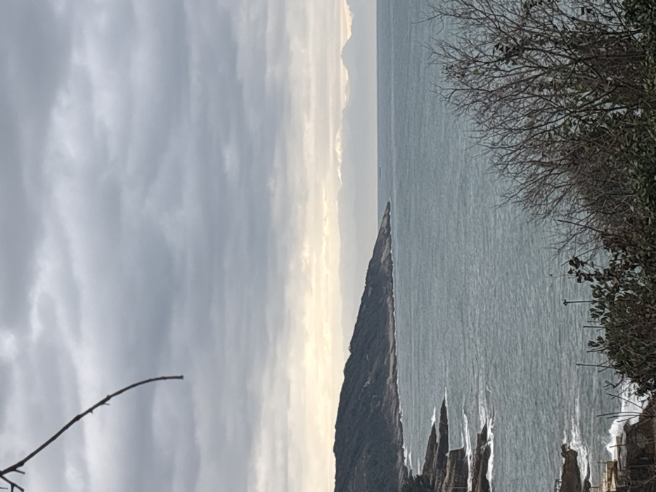 This image presents a coastal landscape in Ulcinj - Ulqin, Montenegro. The scene is observed under a predominantly grey, overcast sky featuring layered clouds, with a brighter, hazy band visible along the distant horizon. The Adriatic Sea occupies the midground, displaying a choppy surface with white-capped waves breaking against a rugged, rocky coastline. This coastline, covered in dense dark green vegetation, extends from the left mid-ground towards a distant headland. Faint, snow-capped or cloud-obscured mountain ranges are visible on the far horizon above the sea. A small, dark vessel is discernible on the open water, positioned to the right of the coastal headland. In the foreground, particularly on the lower right and extending across the bottom, there are bare branches of deciduous trees and clusters of dark green evergreen foliage. On the lower left, along the immediate rocky shoreline, several flat, man-made platforms or structures are partially visible at the water's edge. No individuals are present.
