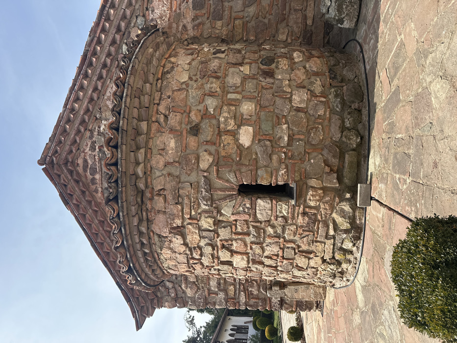 This image displays an exterior view of the Boyana Church, a medieval Eastern Orthodox church located in the Boyana district of Sofia, Bulgaria. The central subject is a curved section of the church, likely an apse, constructed from a distinct masonry style featuring irregular, multi-colored stone blocks interspersed with horizontal courses of reddish-brown bricks. A single, narrow, vertically oriented window with a dark opening is visible in the curved wall, framed by brickwork and topped by a small, horizontal brick lintel. Above the stone and brick wall, a multi-tiered roof structure is present. Immediately above the wall is a curved cornice composed of terracotta tiles, followed by a band of decorative, geometrically patterned relief tiles. The main roof section above this features overlapping, reddish-brown clay tiles. The sky overhead is a clear, pale blue with minimal cloud cover. The ground immediately surrounding the church is paved with irregularly shaped, reddish-brown flagstones. A thin, black hose or pipe runs along the base of the church wall, following its curve. A small, light-colored rectangular block rests on the pavement adjacent to the hose. In the lower left foreground, a meticulously trimmed, spherical green shrub is visible. To the left in the background, a portion of another building with multiple arched windows and additional manicured spherical shrubs indicates a landscaped garden setting. No human figures or active subjects are present in the scene, which is illuminated by direct daylight.