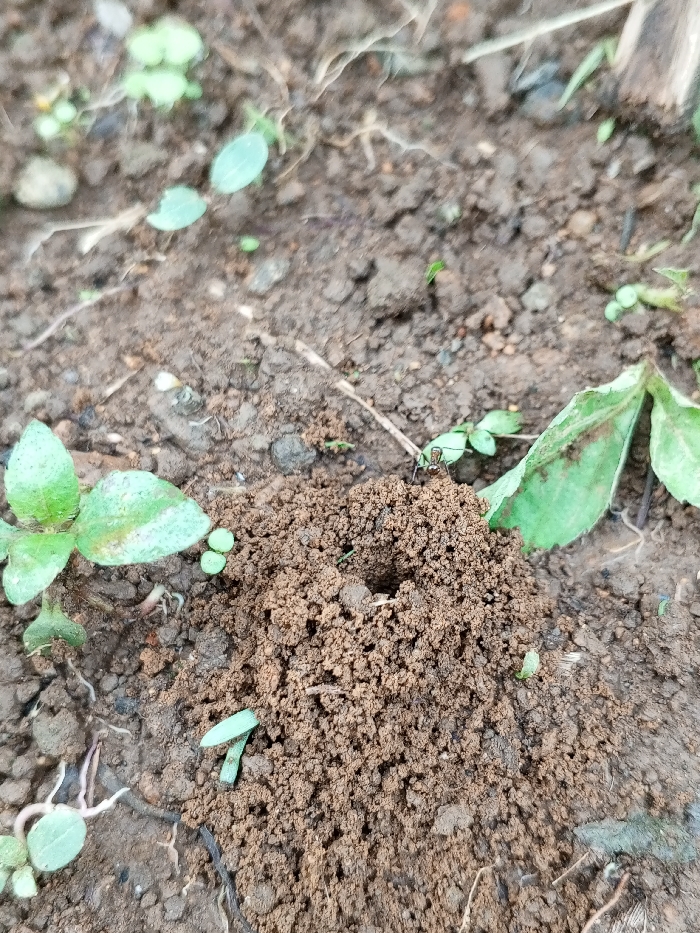 - "A close-up image captures a small, conical ant hill formed from dark brown, lumpy soil, with a distinct central opening" by FM-ohXuq1, licensed under CC BY 4.0