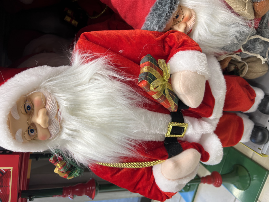 The scene is set in a retail environment in Mondeville, France. A large Santa Claus figurine stands prominently in the foreground, dressed in a red velvet suit with white faux fur trim, a black belt featuring a gold square buckle, and black boots. Its face is flesh-toned plastic with blue eyes, gold-rimmed glasses, a white beard, and a white mustache. The figurine holds a small, plaid-patterned gift box, secured with a gold ribbon, in its right hand, while a golden braided cord extends from its left shoulder. To the right, a second Santa Claus figurine is partially visible, wearing a red hat with gray fur trim and gold-rimmed glasses, and holding several small light-brown burlap sacks. Both figurines are positioned on a metallic gray retail display shelf with a yellow stripe along the edge. A red and green decorative pole is partially visible on the far left.