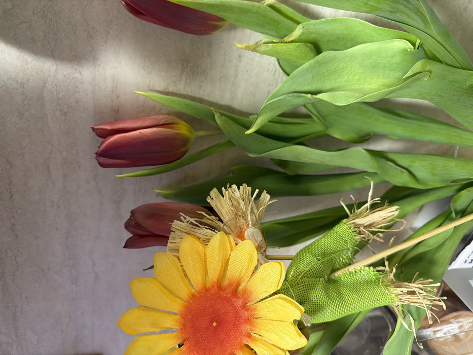 An indoor scene in Sofia, Bulgaria, displays a decorative arrangement. The primary subjects include an artificial sunflower in the lower-left, featuring bright yellow petals and a textured orange center, attached to a light brown straw-like element. Below the straw, a piece of green, loosely woven fabric with fringed edges, resembling burlap, is visible. A slender wooden stick supports this artificial flower structure. To the right of the artificial flower, several closed or partially closed tulips are present, characterized by their deep red or burgundy petals and long, vibrant green stems with multiple green leaves. The background is a light-toned, horizontally textured surface, likely a wall or countertop, exhibiting subtle variations in shade and a cast shadow in the upper right quadrant. No individuals are present.