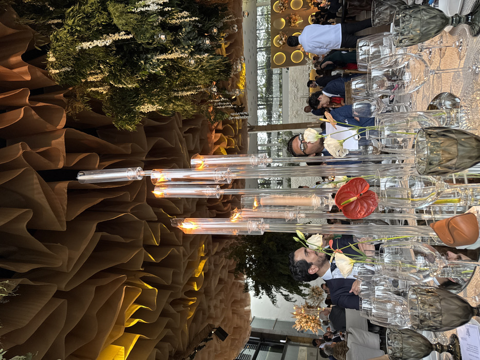 An indoor event is depicted, likely a formal gathering or wedding reception, at Hacienda de Los Morales in Ciudad de México, Mexico. The foreground features a rectangular dining table set with a light-colored tablecloth, multiple clear wine glasses, water glasses, and dark gray textured goblets. A tall, multi-tiered centerpiece occupies the table's center, composed of clear glass tubes containing lit candles and one unlit taper candle, all resting on a reflective surface. Small white flowers and a red anthurium are arranged at the base of the centerpiece. A small, tan, irregularly shaped object is also on the table. In the midground, two men are seated at the table. The man on the left has dark hair and a beard, wearing a dark suit, white shirt, and patterned tie, looking left with a slight smile. The man on the right wears glasses, a dark suit jacket, and a white shirt; his head is partially obscured by the centerpiece. The background reveals a spacious venue with distinctive architectural and decorative elements. The ceiling is covered with numerous undulating, light-colored fabric panels that create a wave-like texture, illuminated with warm, indirect lighting. To the right, lush green foliage with cascading white flowers hangs from the ceiling, interspersed with small, reflective glass orbs. Large floor-to-ceiling windows on the left provide a view of an outdoor area with trees and a light-colored building facade. Further back, a decorative wall features multiple illuminated circular recesses, some containing floral arrangements. Numerous other guests, dressed in formal or semi-formal attire, are visible throughout the space, seated at tables or standing and socializing. One man in a light blue shirt stands with his back largely to the viewer, facing the decorative wall. The overall lighting is warm, combining ambient light from the ceiling, candlelight, and natural light from outside.