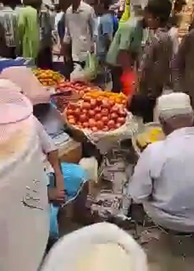 bustling outdoor marketplace in what appears to be an urban setting. Fruit stalls with vibrant displays of apples and oranges are visible. The stalls are crowded with people, many appearing to be shoppers navigating the narrow street. A man wearing a white cap sits amongst the merchandise, presumably a vendor. A large bag of what looks like rice is also visible. The scene suggests a vibrant, busy commercial district filled with people and goods. Tall buildings line the street, indicating an urban environment.