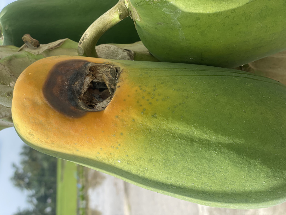 - "A close-up, vertical photograph depicts a ripening papaya fruit afflicted by a significant necrotic lesion, situated on a papaya tree in Kumbang, Indonesia" by FM-56aBo1, licensed under CC BY 4.0