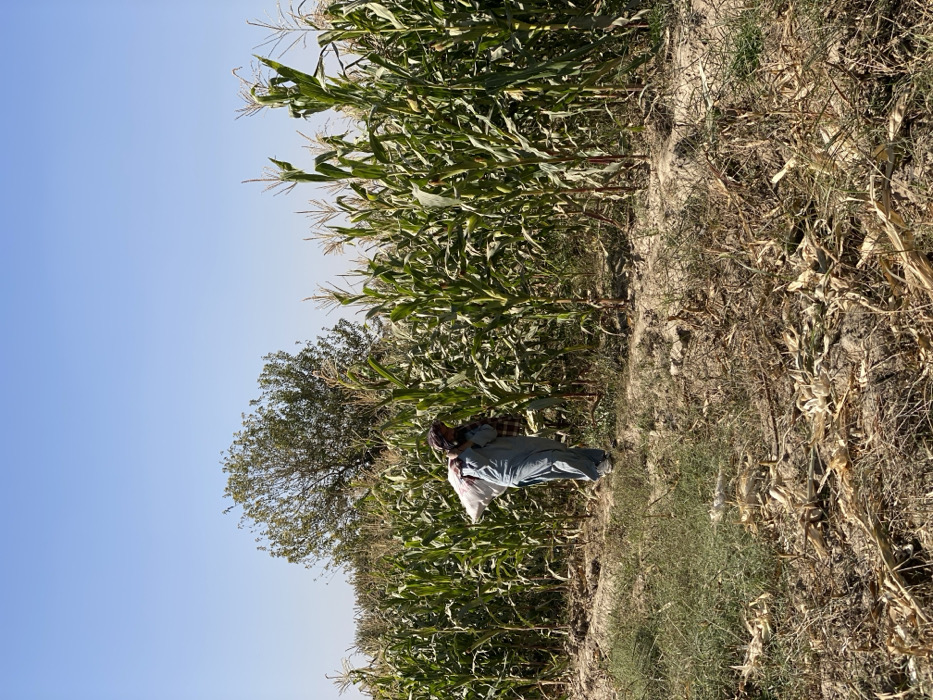 A single individual is depicted walking along a dirt path through an agricultural field in a rural area, city of Unknown, Unknown. The person, an adult, possibly male, wears light blue traditional clothing with a dark head covering partially obscuring the face, revealing a beard. They are carrying a large white sack over their left shoulder, with a red and white plaid fabric visible beneath it. The path is flanked by tall, green corn (maize) plants with visible ears and tassels. A large, deciduous tree with green foliage is present in the background, left of center, behind the cornfield. The ground in the foreground and along the path is dry, light brown soil interspersed with sparse green weeds and numerous dried corn husks and plant debris. The sky is clear and bright blue, indicating daylight with strong, direct sunlight.