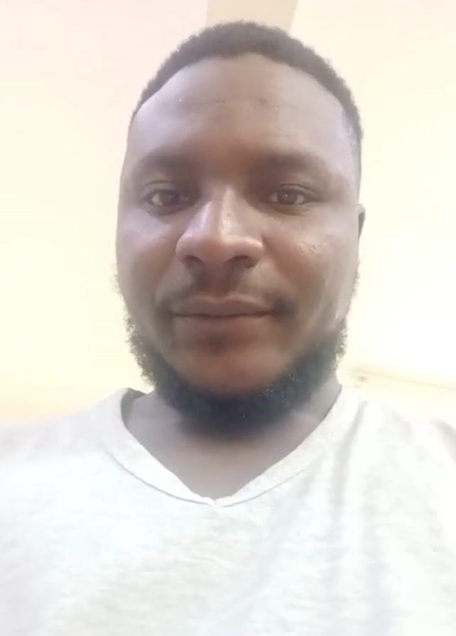 close-up shot of a man's face. He has dark skin, short hair, and a beard. He is wearing a light gray t-shirt. The background is a plain, light-colored wall with a ceiling fixture visible at the top. The man looks directly at the camera, blinking occasionally. There is no other action or interaction in the video.