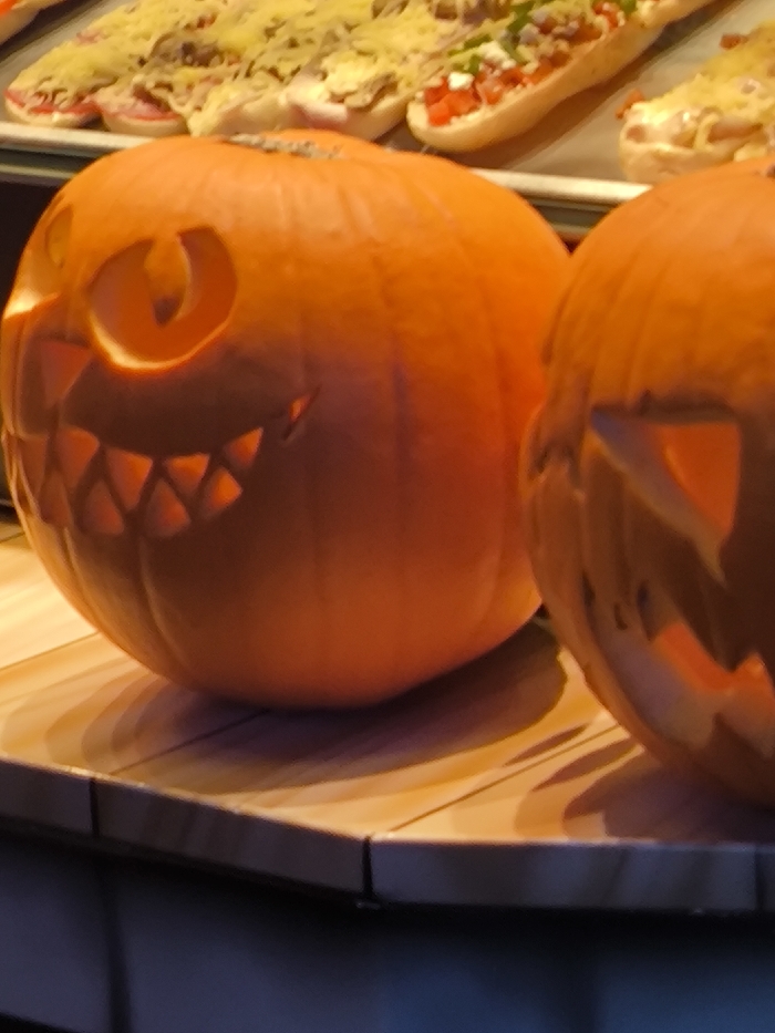 - "The image displays two carved orange pumpkins, commonly referred to as jack-o'-lanterns, situated on a light-colored tiled counter within a commercial food establishment in Dresden, Germany" by FM-QaLrL2, licensed under CC BY 4.0