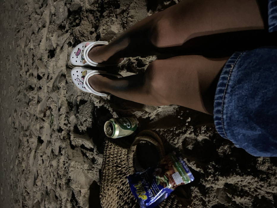 The image displays a first-person, downward view of a person seated on sandy ground at night, consistent with a beach environment in Pattaya City, Thailand. The person's lower legs and feet are visible, wearing white Crocs adorned with various colorful charms. The lower edge of blue denim shorts is also visible. To the left of the legs, a partially open light green Chang Beer can rests upright on the sand. Adjacent to the beer can is a woven straw or rattan bag, partially obscured. A blue plastic bag labeled "Nut Waves Mixed Nuts" is positioned on the sand next to the bag, partially opened. The scene is illuminated by an unseen light source, casting shadows and highlighting the textured sand.