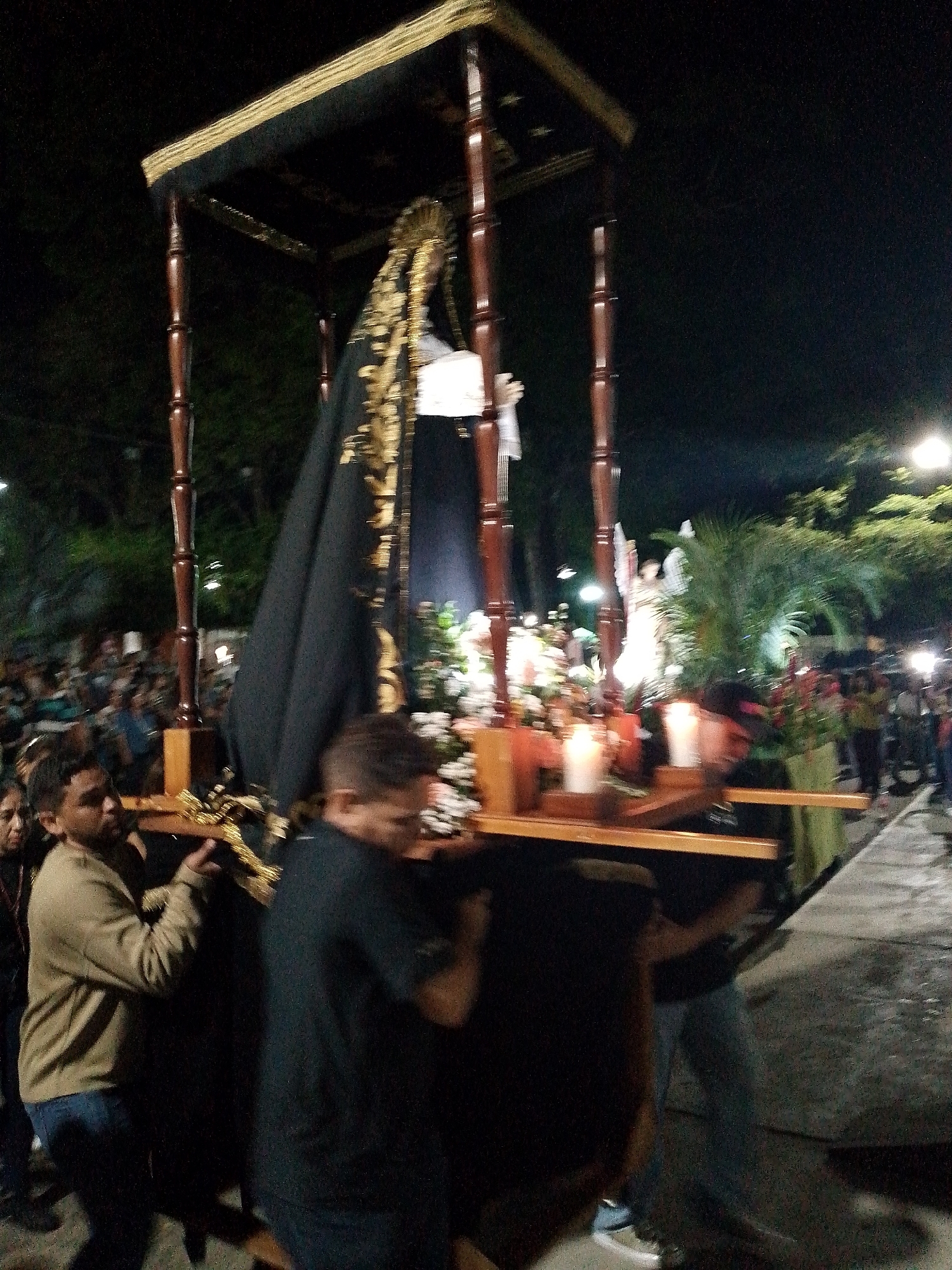 At night in Tinaquillo, Venezuela, a religious procession is underway. A group of men carry a platform with a statue of a veiled figure inside a wooden structure. The platform is decorated with white flowers and lit candles. Other statues and flowers are also on the platform. People stand around watching the procession. The scene is lit by streetlights.
