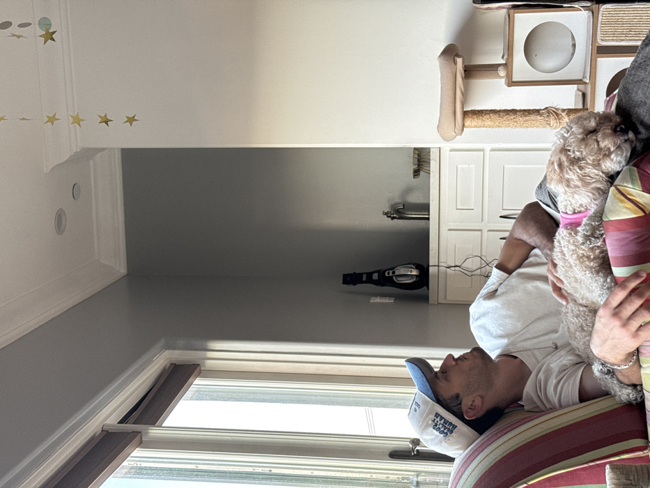 Inside a bright room, a person wearing a hat and white shirt sits on a striped cushion, holding a tan poodle. The room has a window with partially closed blinds. A white cat tree stands to the right. In the background, a gray wall contrasts with the white ceiling, which is decorated with gold stars. There is a door leading to a room with a sink, with a vacuum cleaner lying on the floor against the wall.