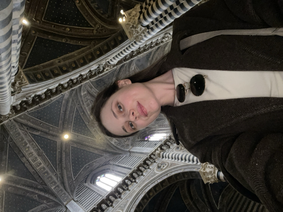 A female individual is depicted in a low-angle photograph, positioned in the foreground and looking directly at the camera with a slight smile. She has dark hair and wears a dark, textured coat over a light-colored top, with dark oval sunglasses hanging on her neckline. A light-colored strap, consistent with a bag, is visible over her right shoulder. The background is the interior of the Siena Cathedral (Duomo di Siena) in Siena, Italy. It features a vaulted ceiling painted dark blue with numerous small white stars, supported by characteristic black and white striped columns and arches. Ornate architectural details and decorative moldings are visible throughout the structure. Stained-glass windows are present in the upper left background, and several bright, circular artificial light sources illuminate the vaulted ceiling.