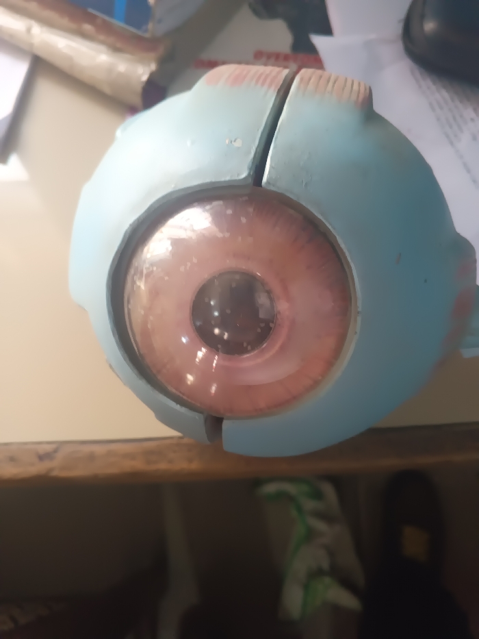 - "A light blue anatomical model of a human eye occupies the central foreground, resting on a light brown surface" by FM-KuKCT2, licensed under CC BY 4.0