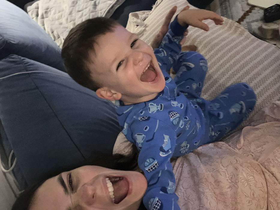 - "A laughing toddler in blue pajamas with hockey motifs sprawls on a bed next to a laughing adult" by FM-igGsn1, licensed under CC BY 4.0