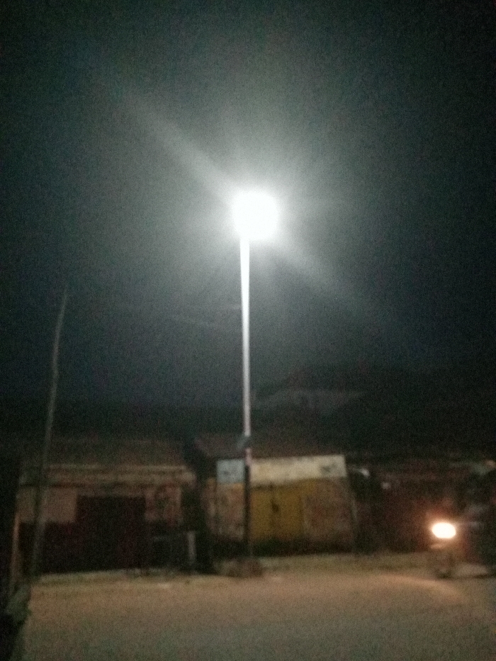 At night, a tall streetlamp illuminates a street and nearby buildings. The light emanating from the lamp is bright and diffuses in the dark. A motorcycle with its headlight on is visible further down the road. Buildings line the street and are dimly lit. The overall scene is dark with the streetlamp being the primary source of light.