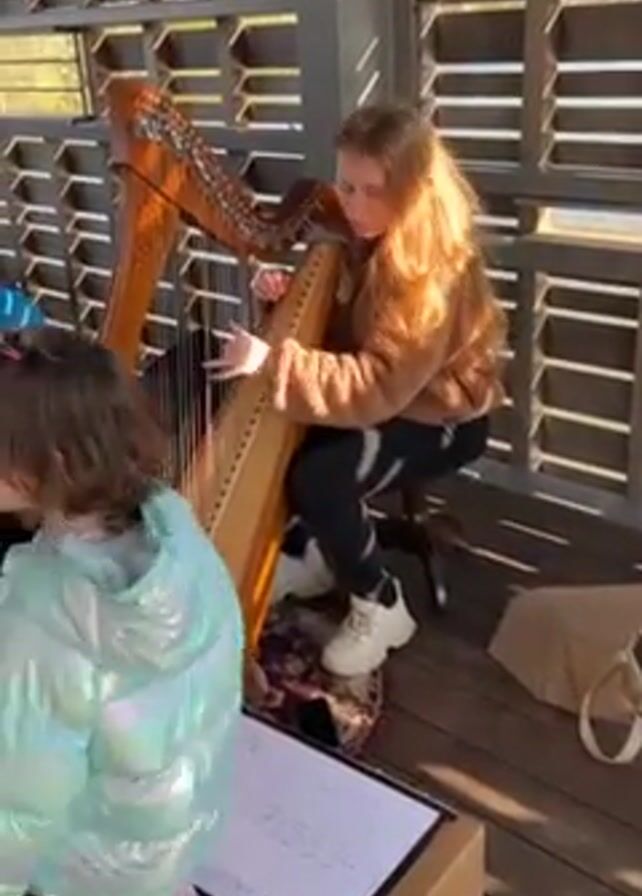 A young, light-skinned woman with long, auburn hair is sitting on a wheeled stool and playing a wooden harp. She wears a brown, fuzzy jacket, black leggings, and white sneakers. She is sitting on a colorful rug. In front of her, resting on a cardboard box, is a white board with numbers and letters written on it. A little girl in a shiny, light blue jacket and pink plaid pants is standing near the box and looking at the woman. There is a beige tote bag next to the cardboard box. The scene is taking place in a structure with an open-slatted roof and walls, allowing sunlight to filter through.
