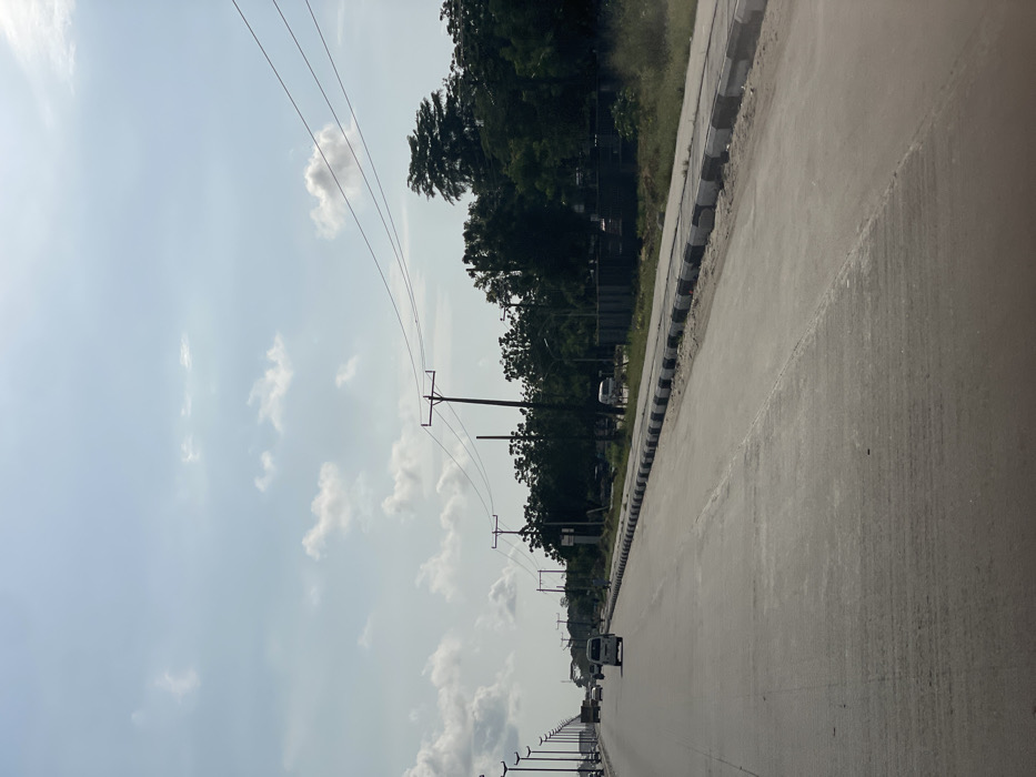A long, straight asphalt road stretches into the distance under a partly cloudy sky. The road is lined with a black and white striped curb. Trees and power lines run parallel to the road on the left. Several vehicles are visible on the road, including a white van. The light is bright, and the overall perspective suggests the photo was taken from a moving vehicle.