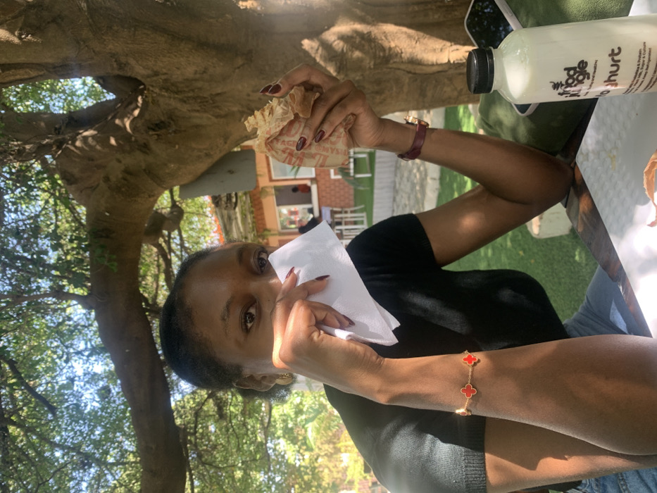 An outdoor, sunlit scene at Food Jungle in Jos, Plateau State, Nigeria, depicts a young Black woman seated at a dark-colored table. She is positioned slightly left of center, looking directly forward. Her left hand holds a folded white paper tissue packet near her nose and mouth, partially obscuring her lower face. She wears a black short-sleeved top, a gold chain bracelet with four red clover-shaped charms on her left wrist, and a dark red watch on her right wrist. Her fingernails are painted dark red. In her right hand, she holds a partially unwrapped food item, likely a sandwich or wrap, encased in patterned paper with red text. On the table, to her right, is a white plastic bottle with a black cap, labeled "Food Jungle Yoghurt," alongside a white smartphone. The background features a large tree with thick branches and green foliage, casting dappled sunlight. Behind the woman, a building with orange-red walls and white window frames is visible, with white outdoor seating on green artificial turf.
