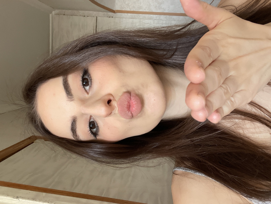 A close-up photograph depicts a female subject indoors. The individual, appearing to be a young adult with long dark brown hair and dark eyes, is centered in the frame, facing the viewer directly. Her lips are pursed forward into a pouting, kiss-like shape. Her right hand is extended forward from the lower right of the frame, with fingers slightly curled and palm partially visible, positioned below her chin. She wears a light-colored garment with a thin strap visible over her left shoulder. The background consists of interior elements: a light-toned wall, a partial vertical wooden frame or beam visible on the left, and a section of what appears to be a light-colored cabinet or partition on the right. No specific geographic identifiers are discernible within the image to determine the location within the city of Moscow, Russia.