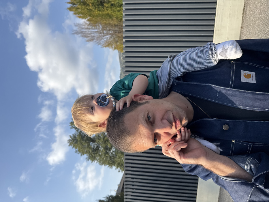- "A front-facing, waist-up portrait captured in Como, Italy, depicts an adult male carrying a toddler on his shoulders under a bright blue sky with scattered white clouds" by FM-SHEMl1, licensed under CC BY 4.0