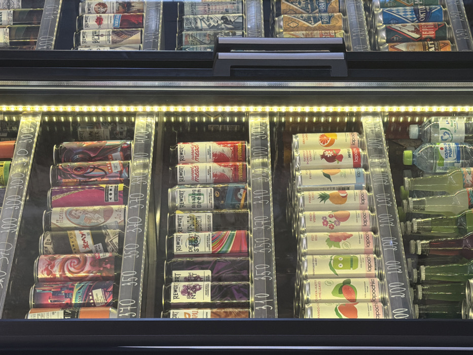 The image displays two adjacent, glass-fronted commercial display refrigerators within an indoor commercial setting in Sergiyev Posad, Russia. The primary focus is the left refrigerator, which is brightly illuminated by vertical LED strips. This refrigerator contains four shelves stocked with various beverages. * **Top Shelf:** Features approximately nine distinct tall beverage cans with diverse, colorful graphic designs, including urban skylines, abstract swirls, money patterns, and a vintage-style woman. Prices ranging from 350 to 400 rubles are displayed below each can. * **Second Shelf:** Primarily holds "Rewort" branded beverage cans. Notable varieties include "Smooth Night," "Desert Storm," "Крылья доблести" (Wings of Valor), "Analog Dream," and "Currant Mead." Some cans also bear the text "OVERDOSE." Prices on this shelf range from 300 to 350 rubles. * **Third Shelf:** Displays "Lapochka" branded cans, each adorned with cartoon-style fruit illustrations, representing flavors such as Mango Guava, Peach Verbena, Pineapple Lychee, Passion Fruit, Raspberry Pomegranate Chamomile, and Grapefruit Lemon. All cans on this shelf are priced at 200 rubles. * **Bottom Shelf:** Contains a mix of glass bottles with various liquid colors (green, amber, clear) and plastic bottles of water, one clearly branded "Капля Родины" (Drop of the Homeland). Prices for items on this shelf range from 200 to 300 rubles. A portion of a second, similar display refrigerator is visible on the right, also stocked with multiple shelves of beverage cans and displaying prices. No individuals, actions, or interactions are depicted in the scene.