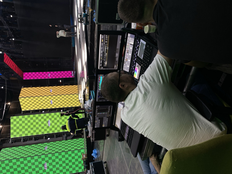 This image captures an indoor production setup within a large event venue or studio located in Cukarica Urban Municipality, Serbia. In the immediate foreground, a male wearing glasses and a light-colored t-shirt is seated, focused on operating a complex control console. This console features multiple monitors displaying graphical user interfaces, along with various faders, buttons, and a trackpad for media or lighting management. To his right, another male, seen from behind in a dark t-shirt, is also seated, with a white paper cup and a red beverage can on the console. The mid-ground reveals a large stage dominated by four tall, vertical LED screens, each displaying a distinctive checkered pattern in vibrant green, yellow, and magenta hues. Near the stage left screens, two individuals are visible: one wearing a dark jacket with yellow reflective stripes, and another in dark clothing with a red stripe. On the stage right portion, two more males are present; one in a light-colored top looks upwards, while the other, dressed in dark clothing, gestures upwards with his right arm. A blue air compressor is visible on the stage floor to the right. The background consists of a dark, intricate overhead rigging structure equipped with theatrical lighting fixtures. The overall scene suggests a technical rehearsal or setup phase for an event or broadcast.