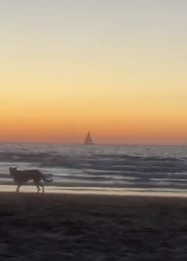 beach at sunset. The sky is orange near the horizon, fading to lighter colors above. The ocean has small waves. A sailboat is visible on the horizon. A dog walks from right to left along the shoreline. The sand is dark in the foreground.