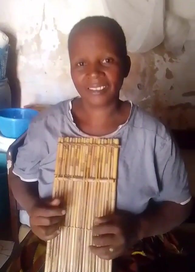 A woman smiles and holds a traditional-looking musical instrument in her hands. The instrument is made of multiple thin sticks, possibly bamboo or a similar material, bound together to form a rectangular shape. She plucks the sticks with her fingers, producing music. She is wearing a gray shirt and a colorful, patterned skirt. The background appears to be a simple indoor space with a slightly worn wall and some household items visible.