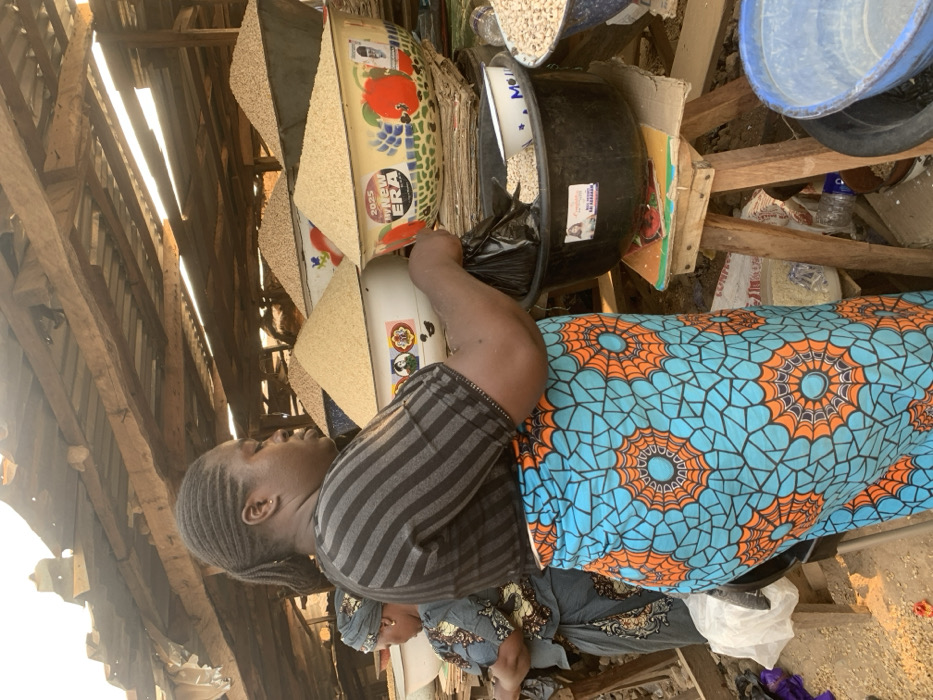 A woman in a gray striped shirt and a vibrant blue and orange patterned skirt stands beside buckets filled with grains under a wooden roof. Her left arm holds a black bag within one of the buckets. Another woman in a patterned headscarf and dress stands slightly behind her. The scene is cluttered, with various containers, buckets, and goods piled up around them.