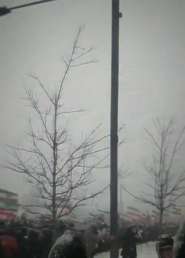 Here is a brief description of the video: The video shows a large group of people gathered in a snowy environment, with the Iranian flag prominently displayed. The setting appears to be urban, with tall buildings visible in the background. The weather conditions are snowy and overcast.