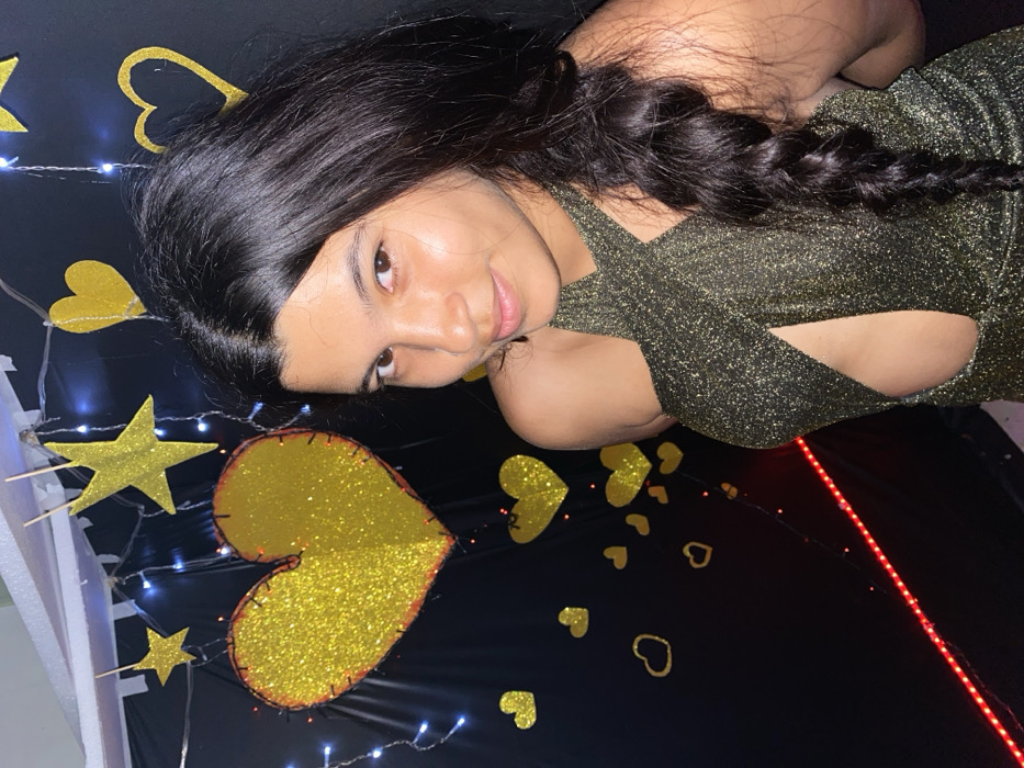 A young woman with dark hair braided to the side is lying down, smiling at the camera. She wears a sparkling gold dress with crisscross straps and cutouts. The background is black with scattered gold glitter hearts and stars. String lights twinkle throughout the scene, and a red light strip adds a vibrant touch. Some hearts and stars are on sticks, adding dimension to the festive backdrop.