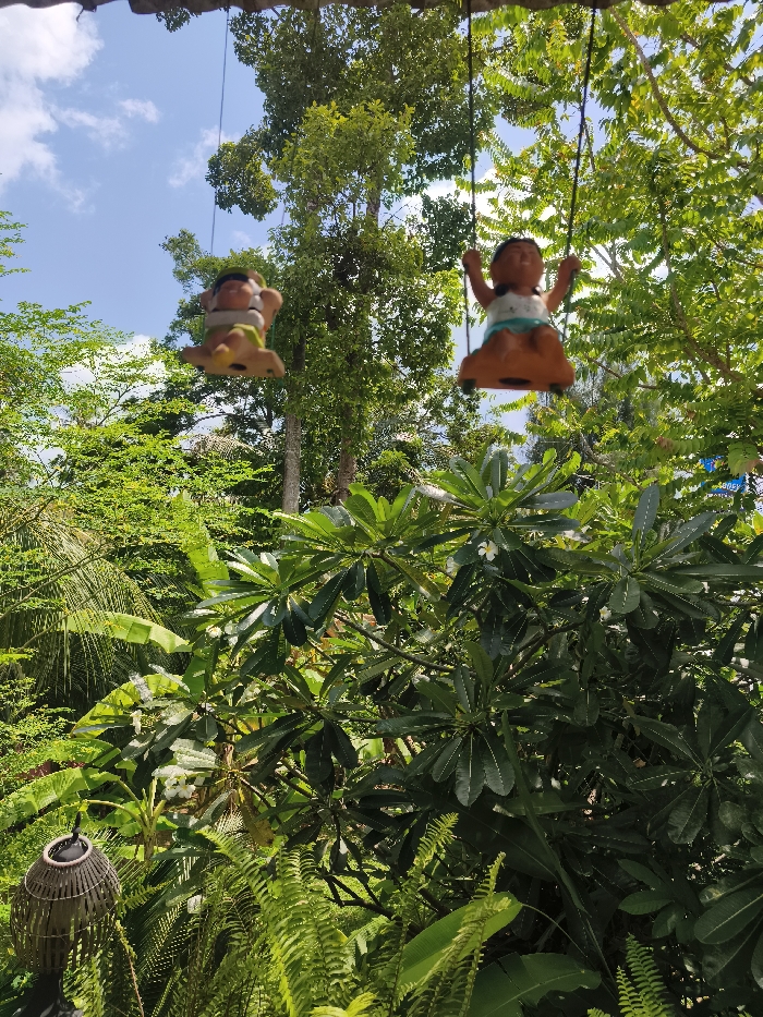 The image captures an outdoor, sunlit tropical garden environment in Baan Hua Thanon, Thailand. The upper portion of the frame features a blue sky with scattered white clouds. Two terracotta-colored ceramic figurines, each depicting a child, are suspended from thin black wires. The figurine on the left is positioned horizontally, appearing to lie on its stomach on a swing, with green and brown attire. The figurine on the right is seated upright on a swing, with arms raised, wearing a white top and blue-green lower garment. The majority of the scene is dominated by lush green vegetation. Tall trees with dense canopies form the background. Closer to the viewer, a variety of tropical plants are visible, including large-leafed bushes, some exhibiting small white flowers (likely Plumeria), broad banana leaves, and ferns. In the lower-left corner, a dark, woven bell-shaped object, possibly a decorative lantern, is partially visible amidst the foliage. The lighting suggests a clear day, with natural sunlight illuminating the scene.