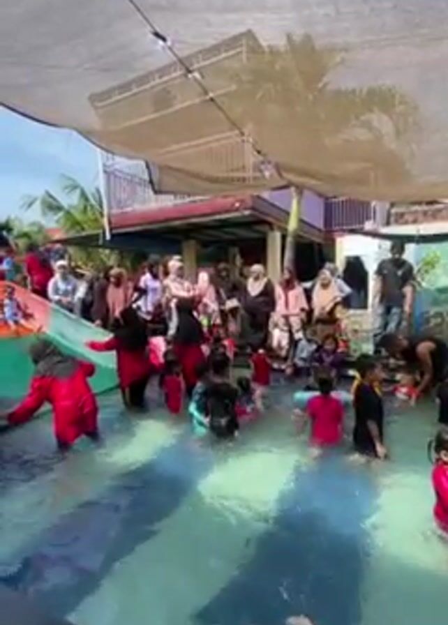 large group of people, mostly children, gathered in and around a swimming pool, and the pool is partially shaded by a white canopy. Many of the children are in the water, with some wearing swimsuits and others in clothing. A small slide leads into the pool from one side, and some children are using it. Around the perimeter of the pool, a group of adults, many wearing hijabs, are standing and watching the children. The environment suggests an outdoor gathering, possibly a party or event centered around the pool. There appears to be a building with a red roof in the background, and some greenery visible beyond that.