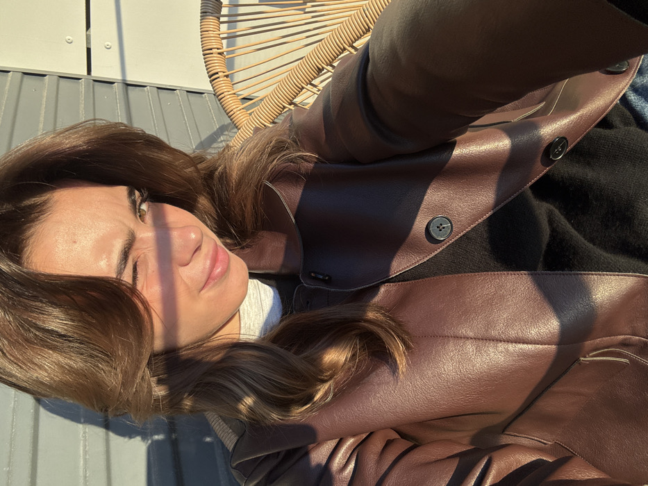 A close-up, self-portrait style photograph captures a young adult female seated outdoors in Loures, Portugal. The subject, positioned centrally, has wavy brown hair with lighter highlights framing her face. Her left eye is closed in a wink, while her right eye is open and looking directly at the camera. A slight smile is visible. She is dressed in a light grey crewneck garment worn beneath an open, dark brown or maroon faux leather jacket, which features dark buttons and reveals a black inner layer. Strong, directional sunlight illuminates the scene, casting distinct horizontal shadow lines across her face and clothing, indicating direct sun exposure. The background to the left consists of a light grey corrugated or horizontally paneled wall. To the right, a portion of a light brown woven wicker chair's backrest is visible. The lighting suggests either early morning or late afternoon.