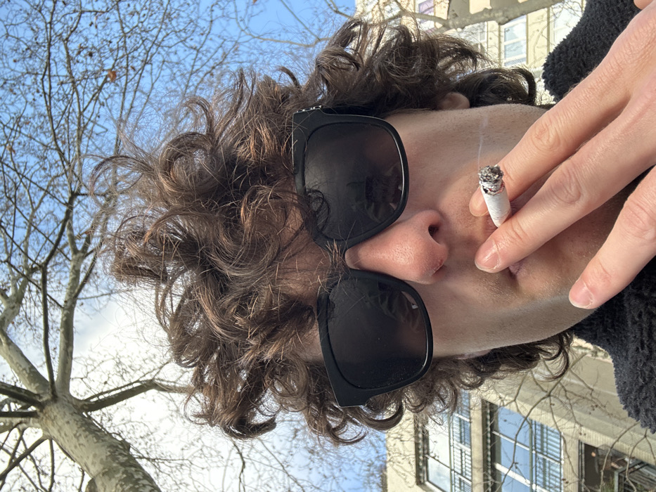 - "A low-angle selfie captures a person with medium-length curly brown hair, wearing black sunglasses and a black textured garment, likely a jacket" by FM-y5OoI2, licensed under CC BY 4.0