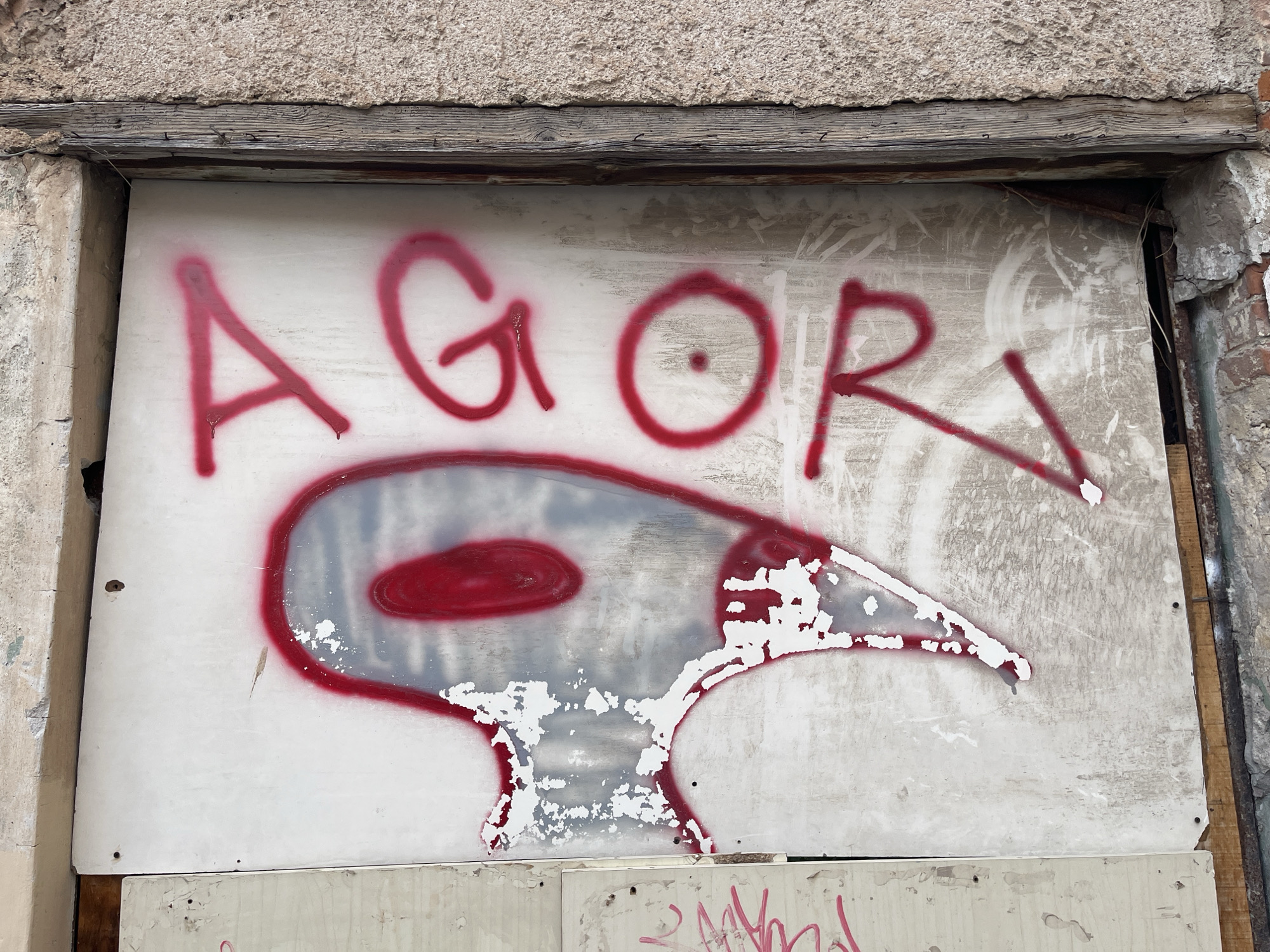 The image captures a forensic view of a graffiti-covered boarded-up opening on a structure within the city of Palermo, Italy. The central feature is a rectangular white board, approximately 2/3 of the frame, secured vertically within an architectural void. On this board, red spray paint displays the capitalized letters "AGOR" across the upper half. Below this text, a stylized bird or duck head is depicted, outlined in red spray paint, with a distinct red circular shape representing the eye or a prominent head feature. The white surface of the board exhibits significant wear, with areas of peeling white paint revealing a grey substrate, particularly within the bird-head design. Minor red paint drips are visible, notably beneath the letter "A". The opening is framed by various weathered building materials. Above the boarded section, a horizontal strip of coarse, light brown or beige stuccoed wall is present, beneath which a dark, aged wooden beam or lintel is positioned. Fine wires or thin metal fasteners are visible embedded in the wood. To the left, a vertical section of a light-colored, irregular concrete or plastered wall borders the opening. To the right, crumbling reddish brickwork and degraded plaster are visible, alongside a vertical corroded metal element. Below the main white board, a smaller, lighter-toned board is partially visible, also bearing faint red spray paint markings. No individuals are present. The scene conveys urban decay or the disuse of the structure where the opening is located.