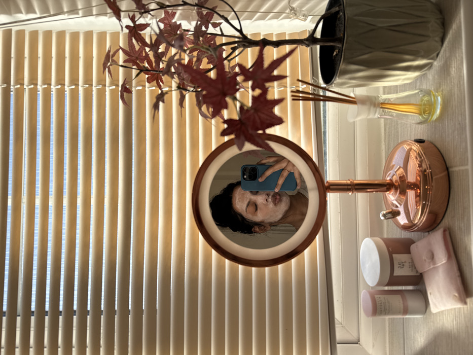 The scene depicts a domestic interior, located in the city of Wychavon, United Kingdom. A window with horizontal Venetian blinds, partially open, allows sunlight to illuminate the area. On a white window sill, several objects are arranged. From left to right, there is a white and pink cylindrical bottle labeled "CENTELLA PHELAB," a peach-colored jar with a white lid and Asian script, and a small, light pink fabric pouch with a single button closure. A central, prominent object is a round vanity mirror with a copper-toned stand and an illuminated light ring. Reflected in this mirror is an adult female. She has dark hair styled in an updo and her face is covered with a white facial mask. She is holding a teal-colored smartphone (consistent with an iPhone model) in her right hand, taking a self-portrait. Her lips are pursed, and a ring is visible on her right ring finger. To the right of the mirror, a clear glass diffuser bottle containing a yellow liquid and several wooden reeds is present, next to a small artificial plant with red, maple-like leaves potted in a grey, textured container. Sunlight casts distinct shadows across the window sill.