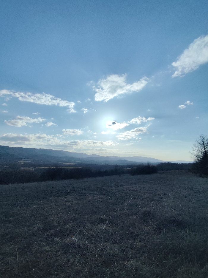 This is a landscape photograph depicting a rural scene in Yankovtsi, Bulgaria. The upper two-thirds of the image present a light blue sky with scattered white cumulus and stratocumulus clouds. The sun is positioned in the upper center-right, appearing as a bright, overexposed light source partially obscured by a cloud, with visible lens flare. A faint white aircraft contrail is present in the upper left quadrant of the sky. The midground features a range of distant mountains or hills extending across the horizon, rendered in shades of blue-grey due to atmospheric perspective. Below the mountains, a valley or lower terrain displays patches of dark, dense vegetation, likely dormant trees, and open fields. The lower third of the image is dominated by a foreground field covered in dry, dormant, brown and grey grass. Bare tree branches are visible on the far right edge, extending into the midground. No human figures, animals, or discernible man-made structures are present within the frame.