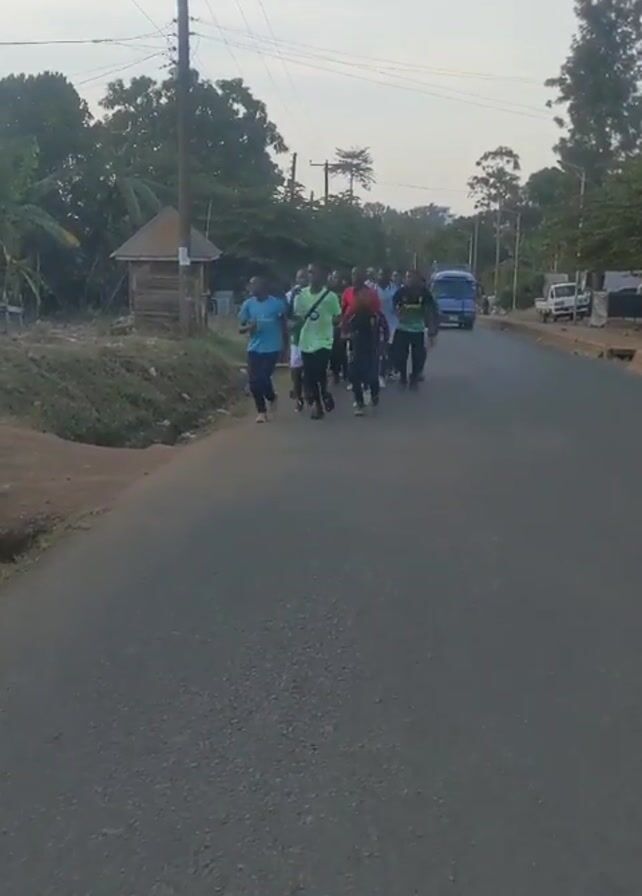 A group of approximately a dozen young men are jogging along a paved road in a rural area. They are dressed in a variety of casual athletic wear, including t-shirts, shorts, and running shoes, with some wearing soccer jerseys. A light blue passenger van follows the group from a distance. The road has a dirt shoulder on one side, with a small, wooden structure visible in the background. Power lines run above the road. The weather is overcast, suggesting either early morning or late afternoon.