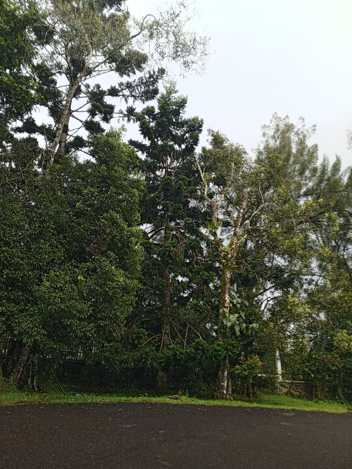 A cluster of various trees in a verdant setting under a cloudy sky. Dominating the scene are tall trees with lush, green foliage. The ground is covered in a dark, asphalt-like surface with a strip of green grass between it and the trees. The density of the trees creates a sense of depth, with some appearing closer than others.